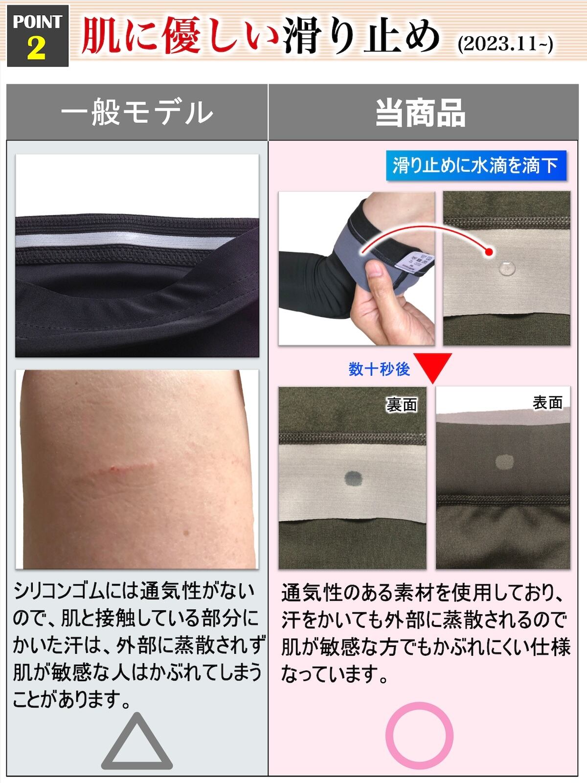 ずれ落ちを防止する滑り止めは、吸水性のあるしっとりソフトな素材を採用することで汗を外部に蒸散させることができ、汗かぶれを引き起こしにくくしています。